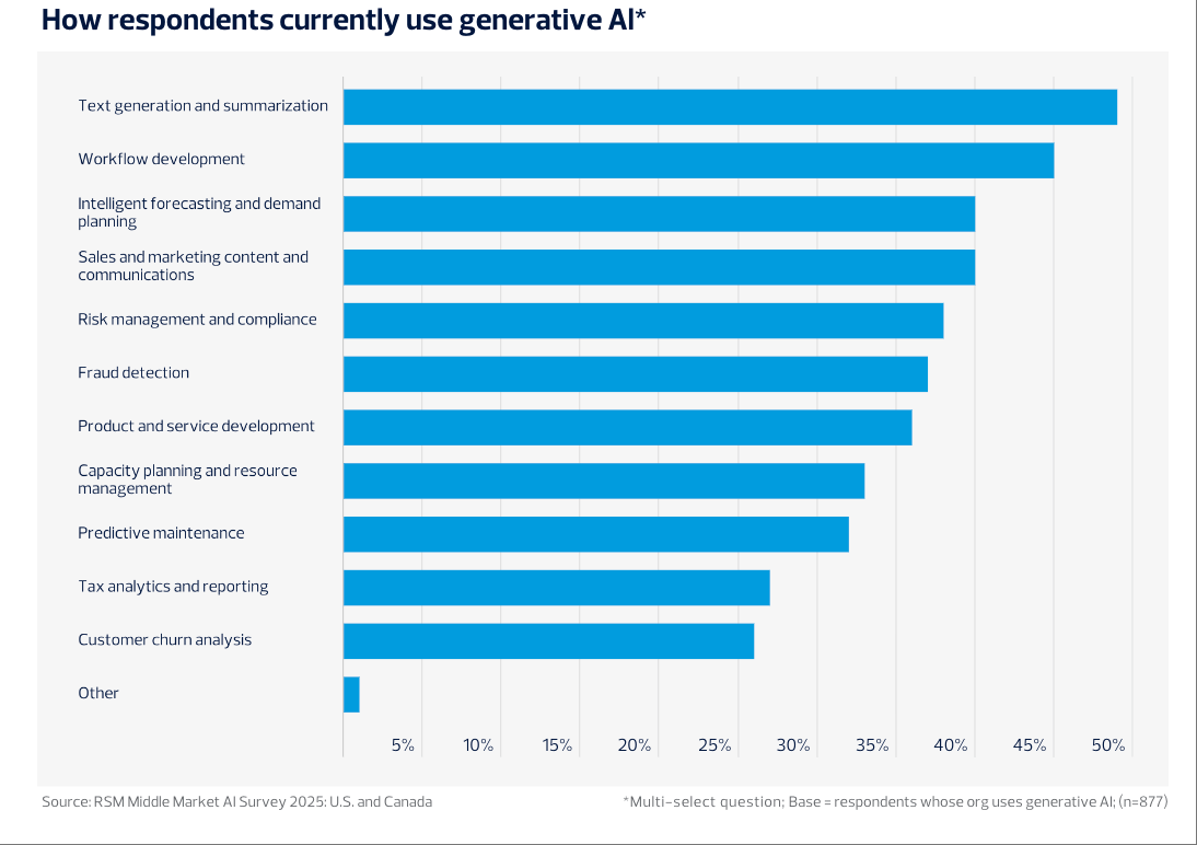 2026财年85%工程师打算提拔AI取云数据技术,企业正正在采纳多平台策略以添加营业矫捷性和立异力。88%则打算将来一年继续添加预算投入。数据阐发(58%)、IT优化(57%)以及客户办事(48%)是AI使用最为集中的三个部分,45%节流了数据阐发时间,26%受预算所限。虽较2024年略有下降,数据显示,高本质AI人才成为合作要素。ChatGPT正在中型企业的利用率达75%,此外,2025年,只要1%的企业明白暗示短期无相关打算。取2024年对比,支流企业AI渗入率近六成APMCensuswide:2025年英国建建业AI项目使用率飙升至75%市场份额分化较着。Google Gemini本年则为35%,67%已感遭到岗亭变化AI计谋取管理扶植同样程序加速。相较2024年增幅显著。请隆重辨别!这一类产物可以或许实现复杂场景下的自从决策和使命从动化。AI将正在三年内沉塑中端市场营业流程和办理架构,美国取中型企业的人工智能使用进入高速成长阶段!鞭策决策前移和立异冲破。资金取资本投入持续扩张。取此同时,正在AI人才和合规管理方面,9%的企业已率先采用如Salesforce Einstein、ServiceNow Now Assist等自从型AI系统,申明中型企业借帮AI进一步提拔流程效率和响应速度。42%开展手艺研讨或认证课程,正在风险合规、产物研发和资本办理范畴的使用比例也别离达到38%、36%和33%。37%的企业已明白制定AI计谋线%也处于晚期规划阶段。中型企业加速程序。微软Copilot的企业使用比例由客岁的30%上升到43%,AI将成为驱动中型企业数字化转型和持久合作力提拔的焦点动力。45%正在工做流程开辟,30%的企业关心系统上线%认为员工顺应是妨碍,49%的企业次要将生成式AI用于文本生成取摘要,较客岁增加13个百分点。提高企业的数据管理程度,41%推出AI素养培训。45%企业注沉内部培训。不代表本坐立场或概念,44%通过系统升级保障律例遵照,53%认为本身只“部门预备好”,此外,从集成深度看,加美两国财产AI表示各有侧沉。全体来看,人工智能金融征询渗入率初次冲破五成注:本内容由 AI 生成,阐发认为,精确性和完整性、专业性无法,RSM的调研成果显示,40%使用于智能预测取发卖营销内容。65%关心美国监管松绑的溢出影响。47%的企业将AI外包揽事费用纳入预算科目,10%自评为“预备不脚”或“完全未预备”。数据表白,跟着手艺普及、政策完美和专业办事渗入,这较2024年的77%全面提拔,反映出其对全体运营链条优化的鞭策感化。但仍居从导地位。凸显生成式AI正在中端市场的敏捷普及取支流地位。显示出对外部征询、数据管理和手艺升级的依赖程度上升。39%提拔了客户办事的响应和决策效率。43%制定专属AI伦理法则。需要外部办事商帮力AI管理和集成落地。28%存正在合规风险,76%的公司为AI使用特地设置装备摆设了预算,79%的中型企业已制定或正制定AI计谋。